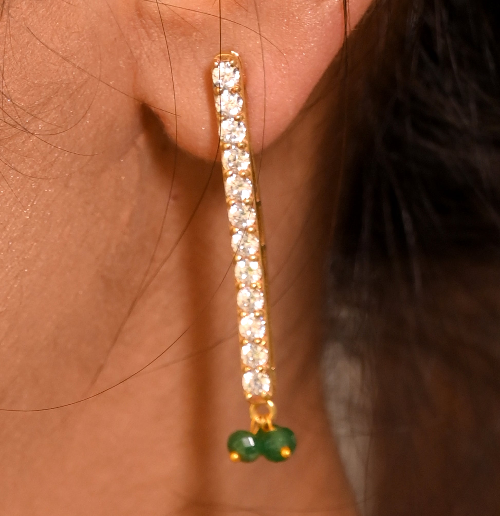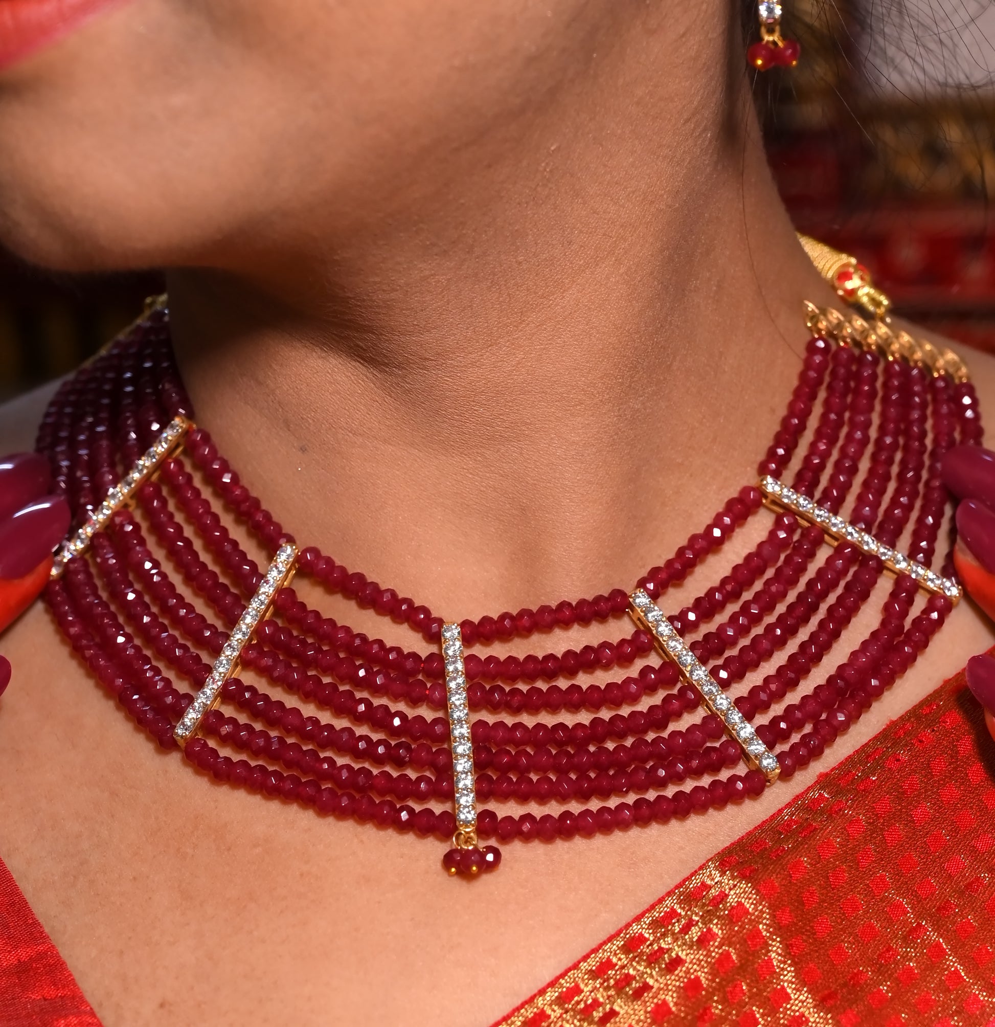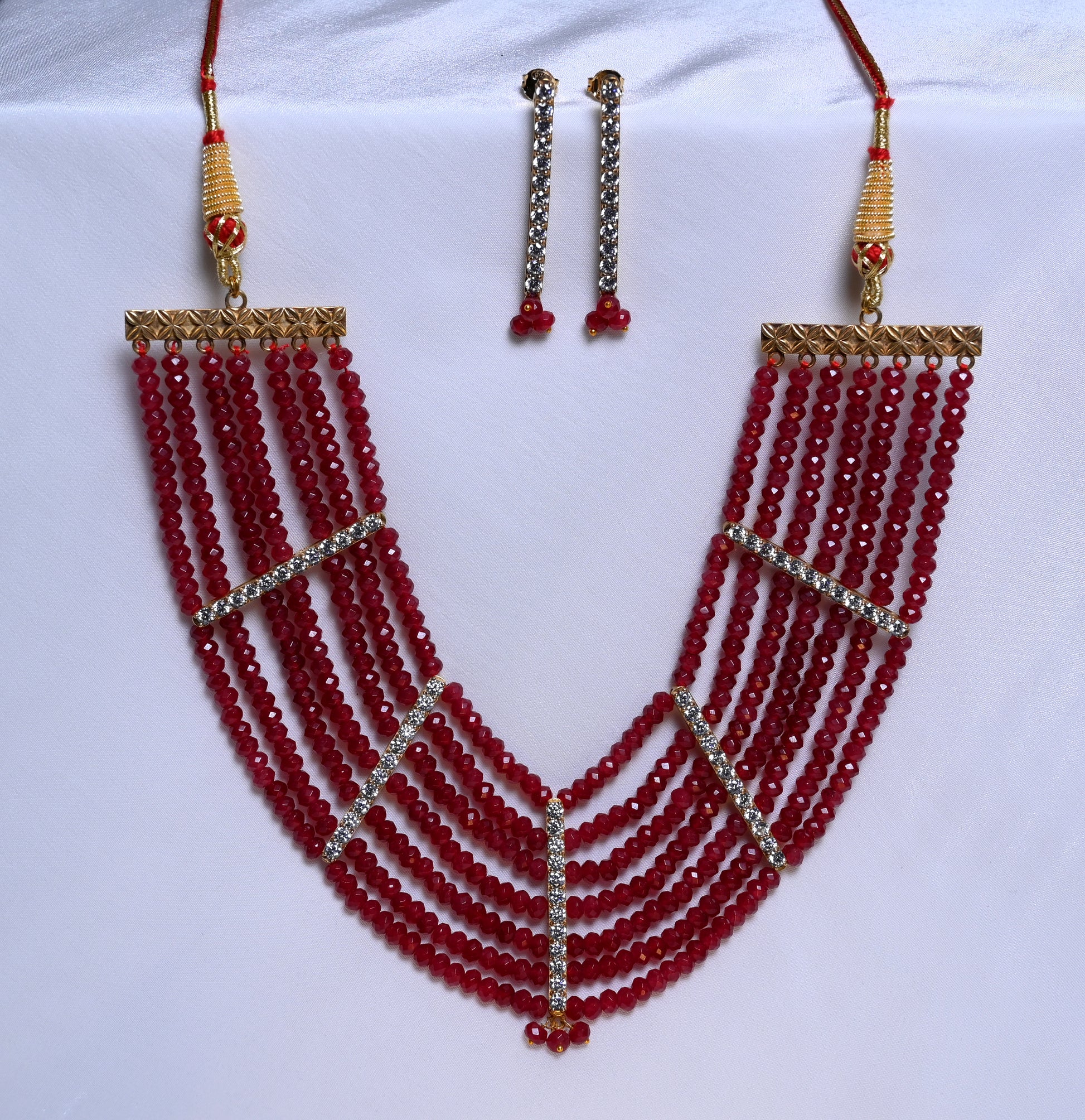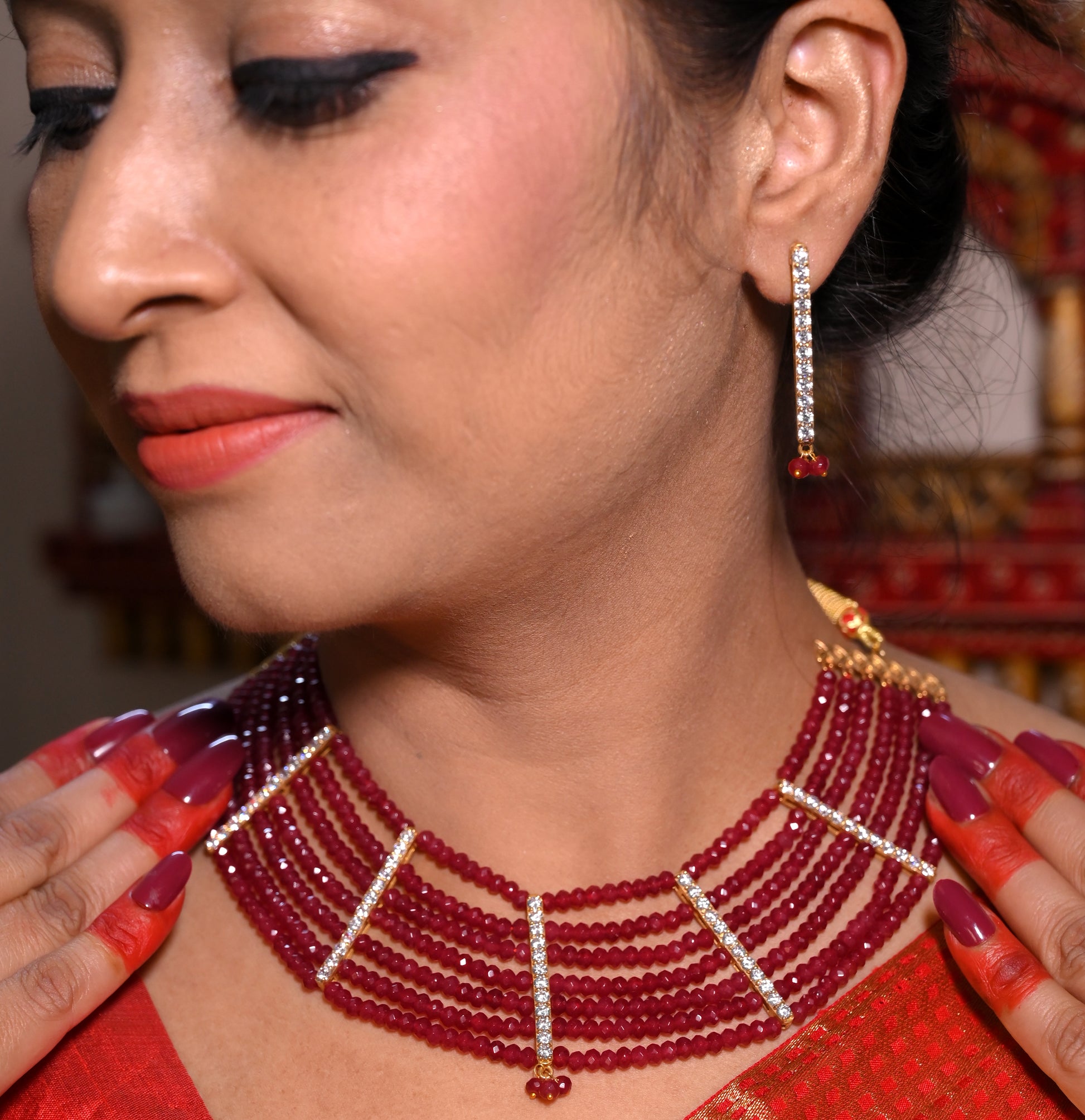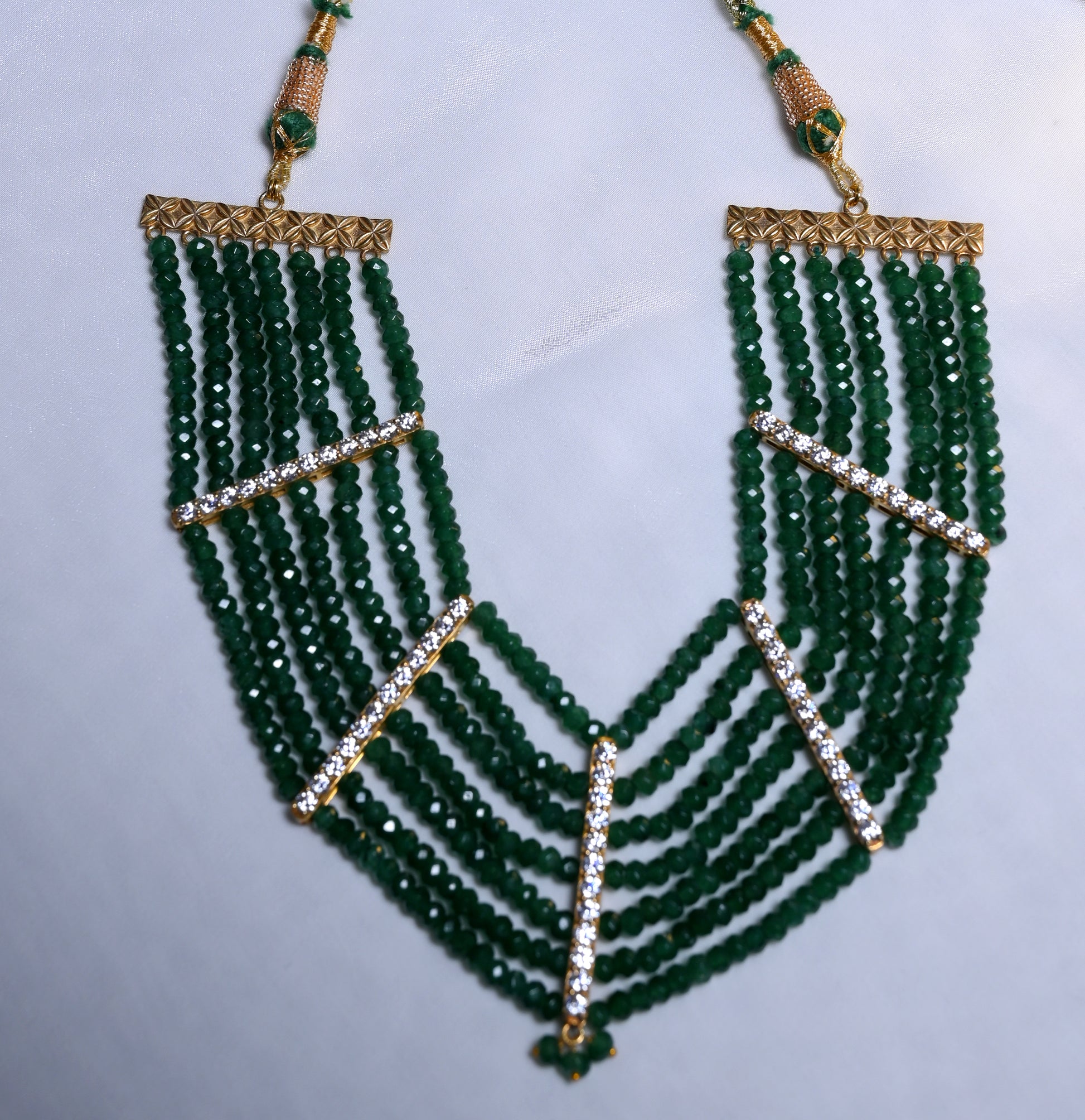 A symbol of timeless beauty and sophistication! Make a royal statement with this exquisite green beaded necklace set. Featuring multiple strands of shimmering green , ruby beads, adorned with dazzling stone-studded bars and intricate golden floral connectors, this masterpiece blends tradition with elegance. Paired with long, graceful earrings, it is perfect for weddings, festive occasions, and grand celebrations.