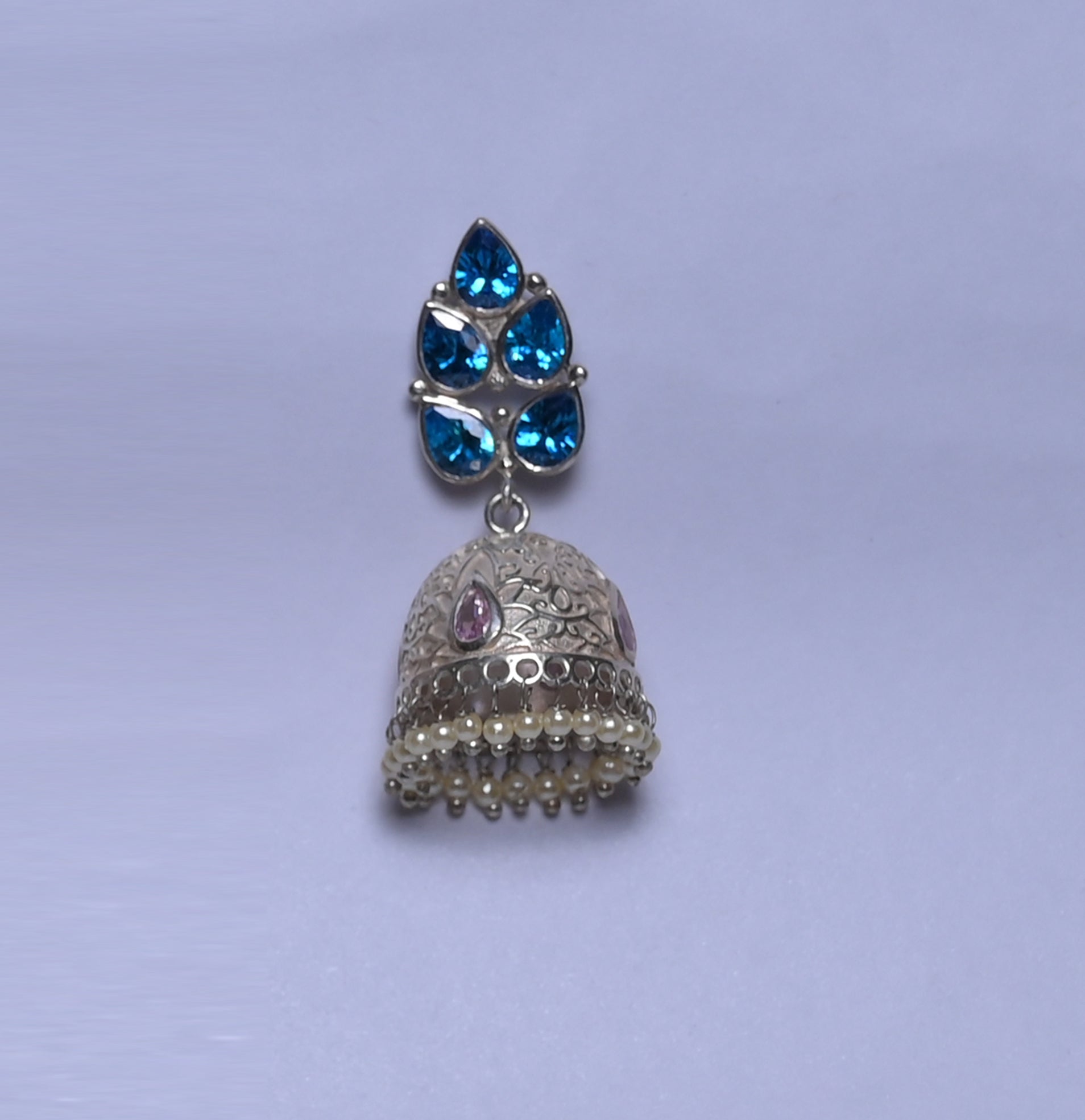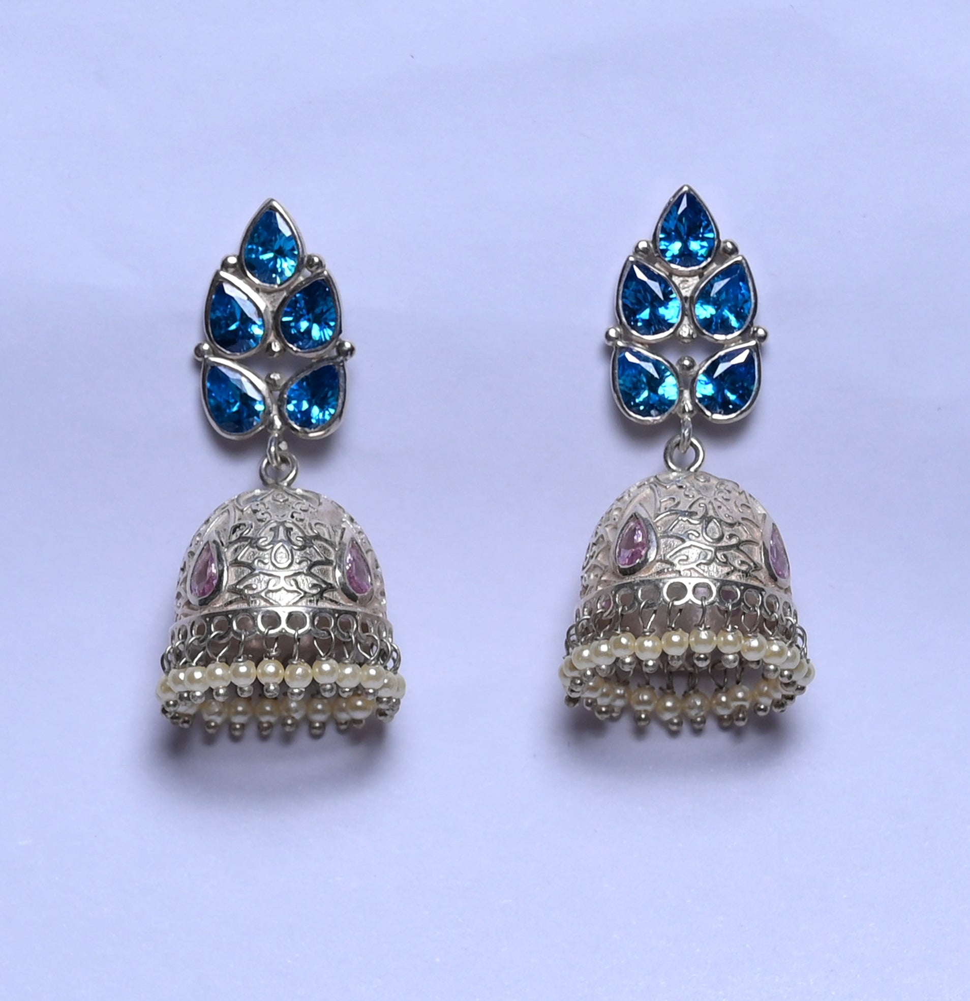 A stunning pair of handcrafted silver jhumkas, adorned with vibrant blue stone studs in a floral cluster design on top. The dome-shaped jhumkas feature intricate engraving and are embellished with delicate pearl danglings, adding movement and elegance. The combination of bold blue stones, detailed silverwork, and pearl accents makes these earrings perfect for festive occasions, weddings, or traditional celebrations.