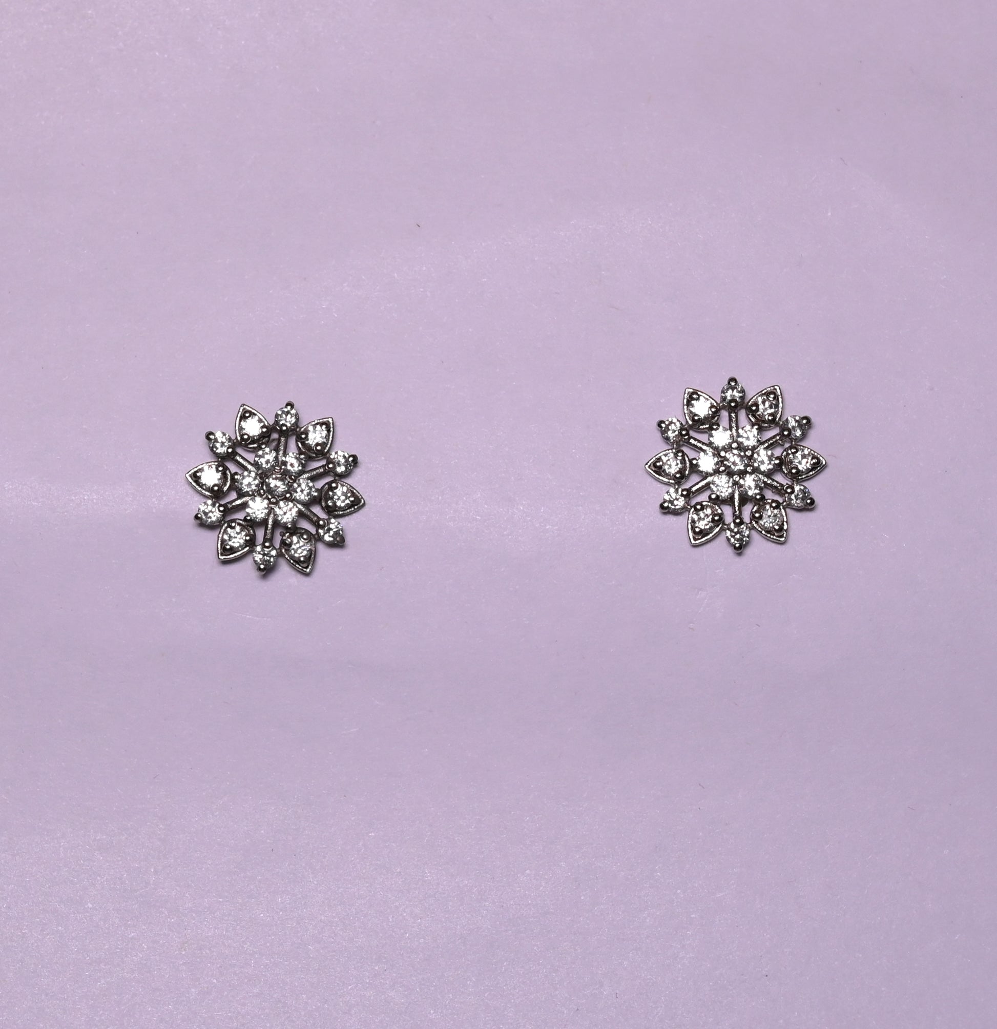 These are elegant 92.5 silver earrings designed in a floral, snowflake-like pattern. The earrings are studded with sparkling white stones, arranged in layers with a central cluster surrounded by petal-shaped settings. The intricate design gives them a radiant and luxurious look.