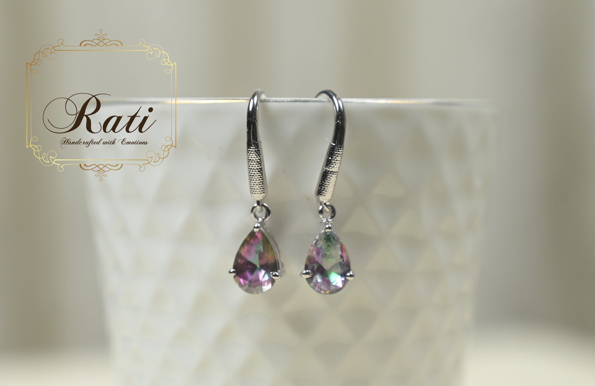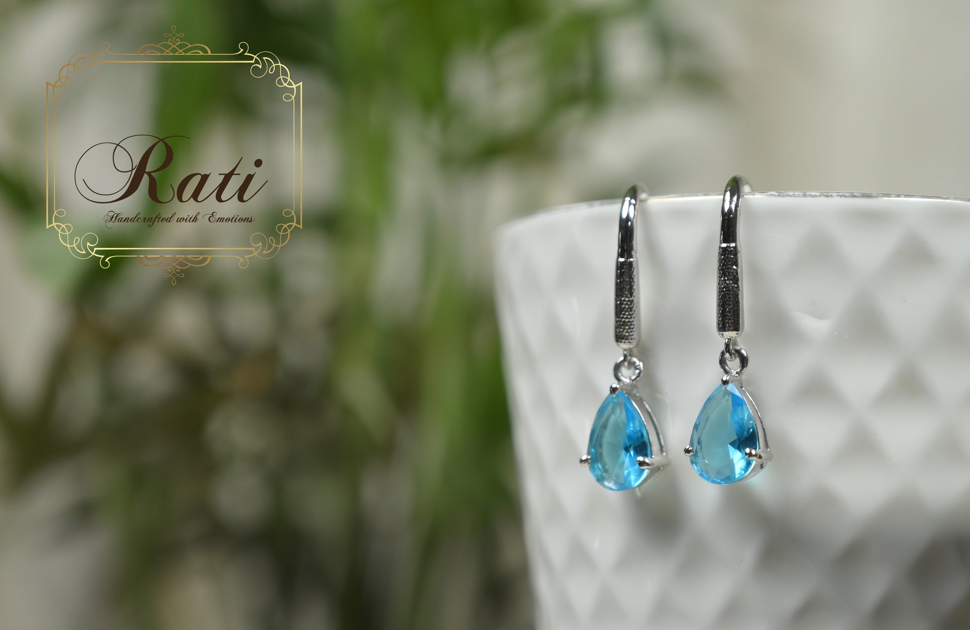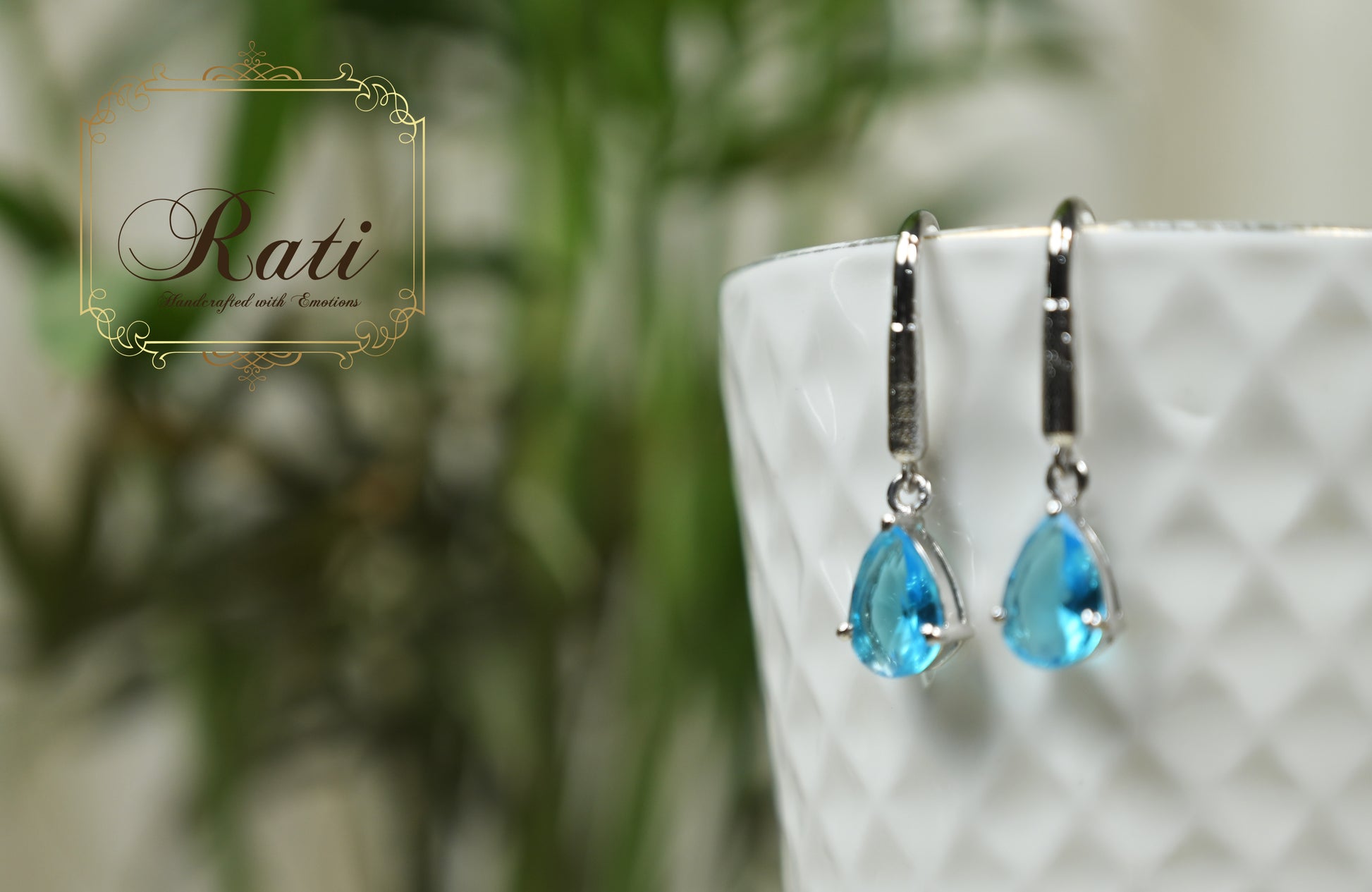 GLEAMIMG DEW DROPS -earrings feature a sleek silver hook design holding a teardrop-shaped coloured gemstone. The stone has a brilliant cut to catch and reflect light beautifully. The minimal silver frame enhances the gem’s natural glow,
