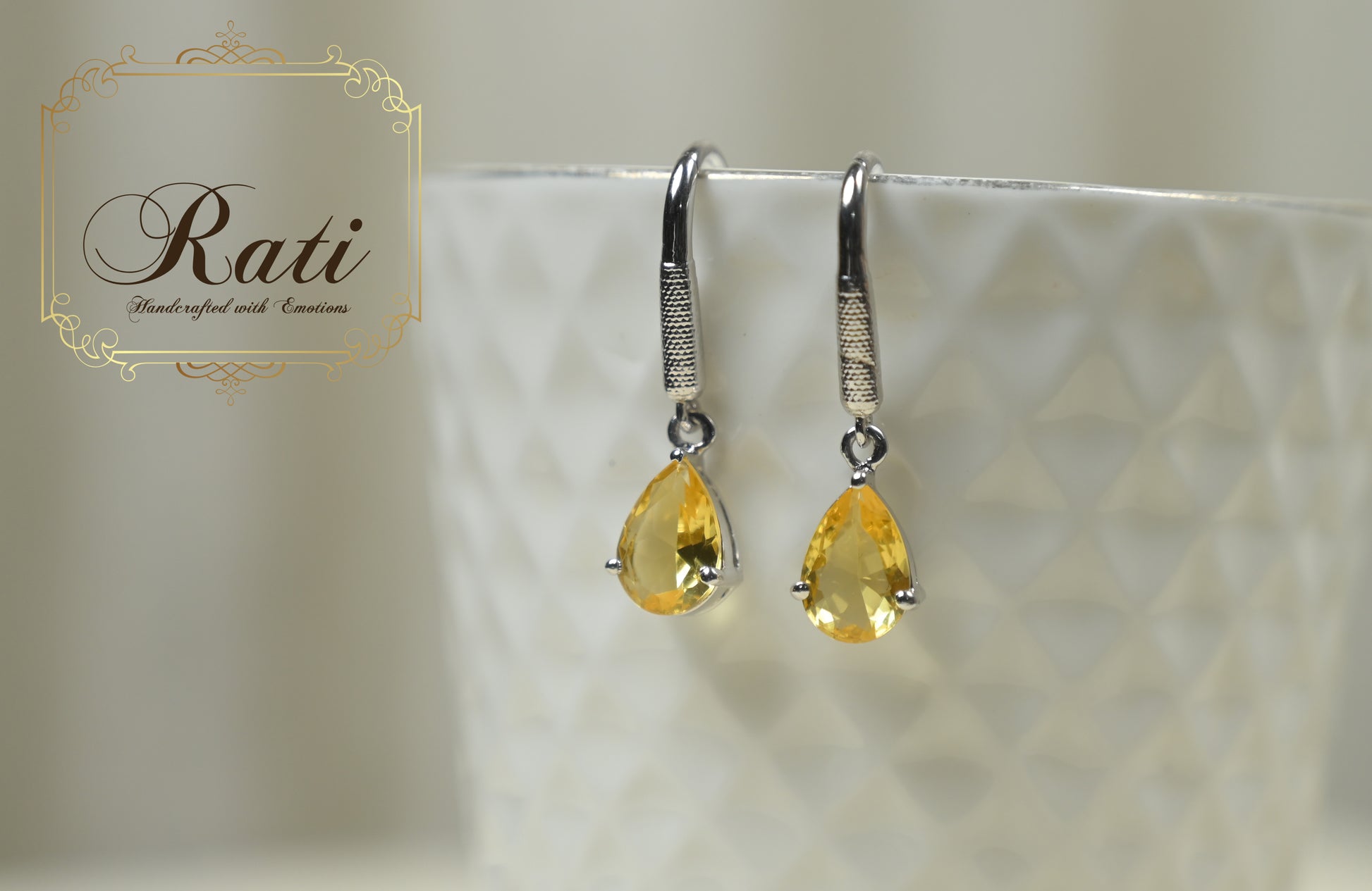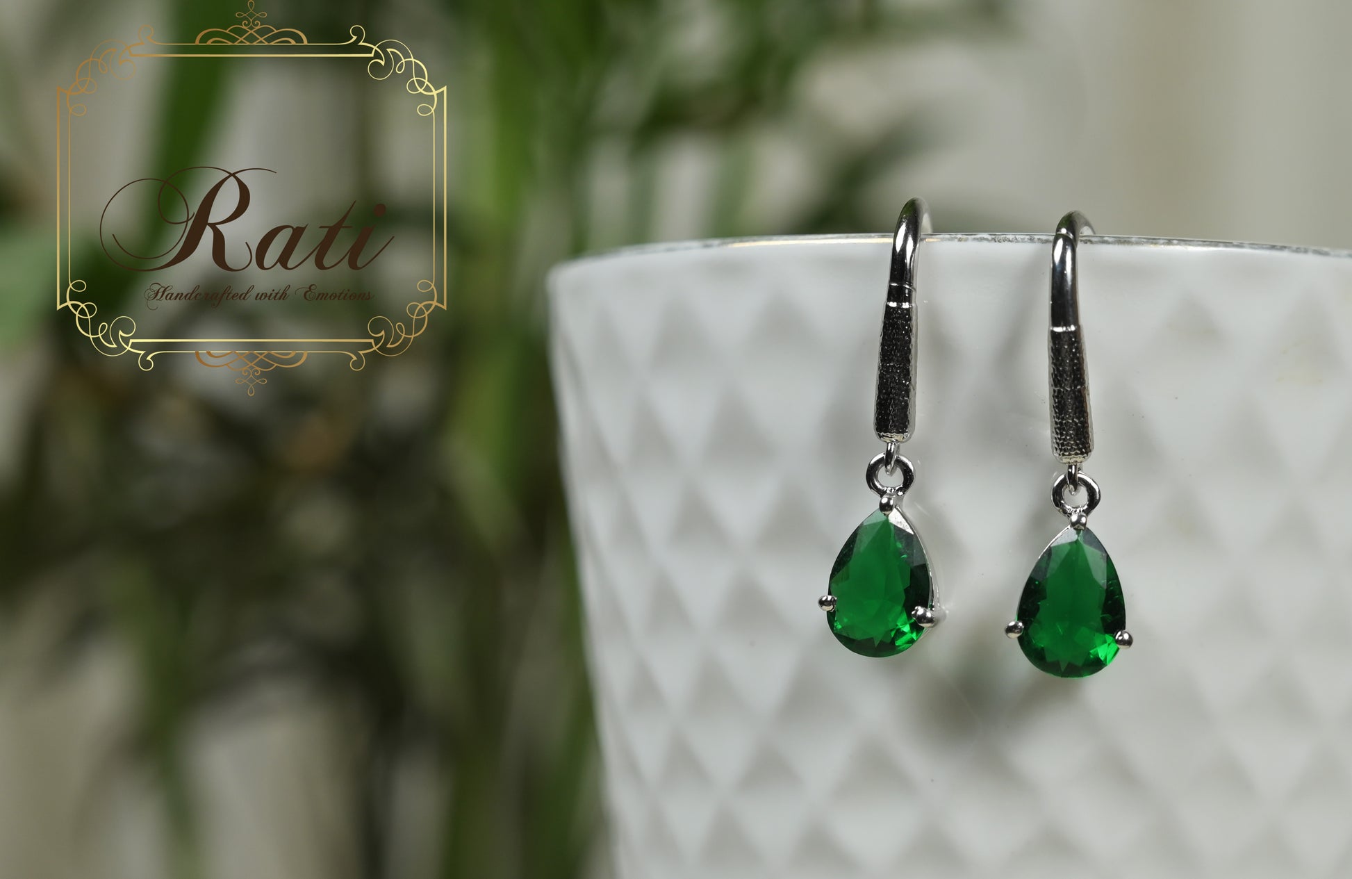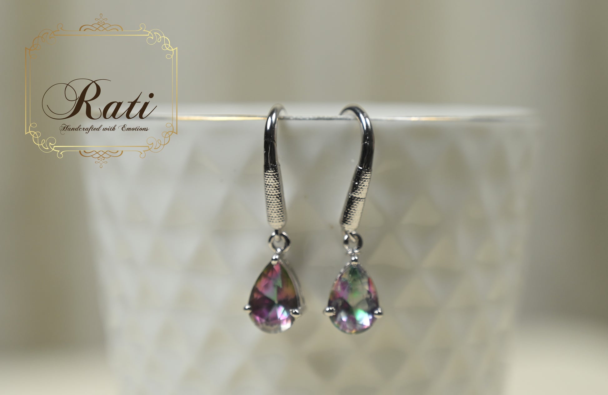 GLEAMIMG DEW DROPS -earrings feature a sleek silver hook design holding a teardrop-shaped coloured gemstone. The stone has a brilliant cut to catch and reflect light beautifully. The minimal silver frame enhances the gem’s natural glow,